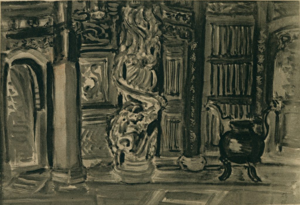 除此之外,若注意〈龍柱〉的筆法細節,例如畫面下方踏階與簷廊臺基的部分,濕潤而漸層暈染的筆觸尤為明顯,推測〈龍柱〉使用的媒材應為水彩。由於黃奕濱師從石川欽一郎、並主要以水彩創作,(註2)或許可以推測,李揚波以水彩作為媒材,可能多少受到黃奕濱的影響。