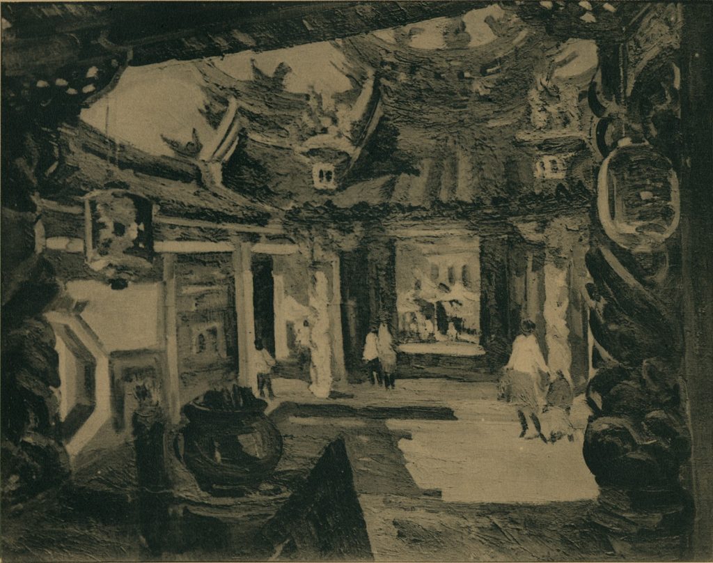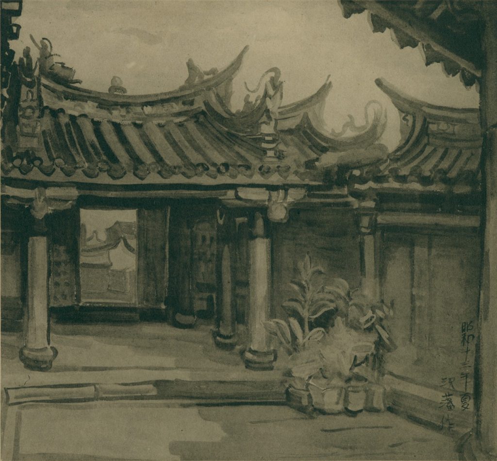 以廟宇為題材的入選作品並不罕見,不乏描繪廟宇紅瓦屋簷、翹脊燕尾的建築外觀,抑或是廟埕前人眾會聚的熱鬧場景。臺灣傳統廟宇的外觀,也確實是當時許多藝術家落筆著力的重點,誠如石川欽一郎(1871-1945)所言:「如果觀察臺灣的建築物的話,例如廟宇屋頂的燕尾向兩端翹起,形成尖細狀,飛向天空,令人一眼就注意到強烈的線條。」(註1)