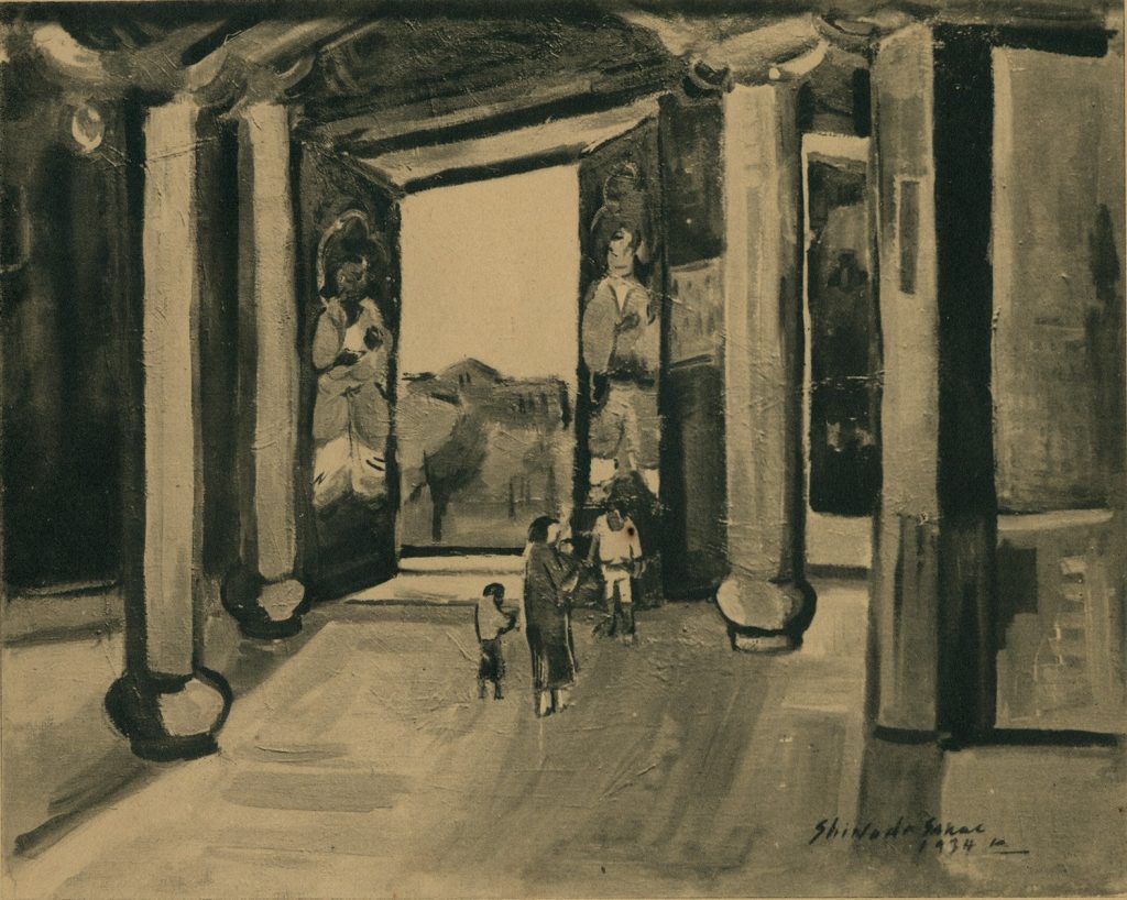 相較之下,關注於寺廟內部空間的作品則屬於少數。不過,我們仍然可以找到一些相關題材的作品,例如楊啟東(1906-2003)於1934年入選第八回臺展的作品〈廟內〉(圖2),以及1938年第一回府展李澤藩(1907-1989)的〈午後〉(圖3),畫面以稍斜的視角,從廟宇深處朝外望向三川殿的大門。兩件作品皆善用中庭天井介於室內與室外、封閉與開放的空間格局,一方面為畫面提供光源,陽光斜照進天井,邊牆的倒影映入中庭;另一方面,從天井仰望三川殿翹脊的「天際線」,又可以平視四周的廟內細節。尤其像是楊啟東的〈廟內〉,捕捉燈籠、籤筒、香爐與信徒等元素,使整體作品更加豐富而有層次。取景之精妙,可謂一舉數得。第八回臺展入選的篠田榮(生卒年不詳)〈廟〉(圖4),則選擇透過人物與空間比例的縮放,烘托出廟堂的寬敞與碩大的檐柱;當陽光穿過中門、掠過彩繪門神與信眾們的足下,灑落在微微上升抬起的地面,營造出戲劇性效果。