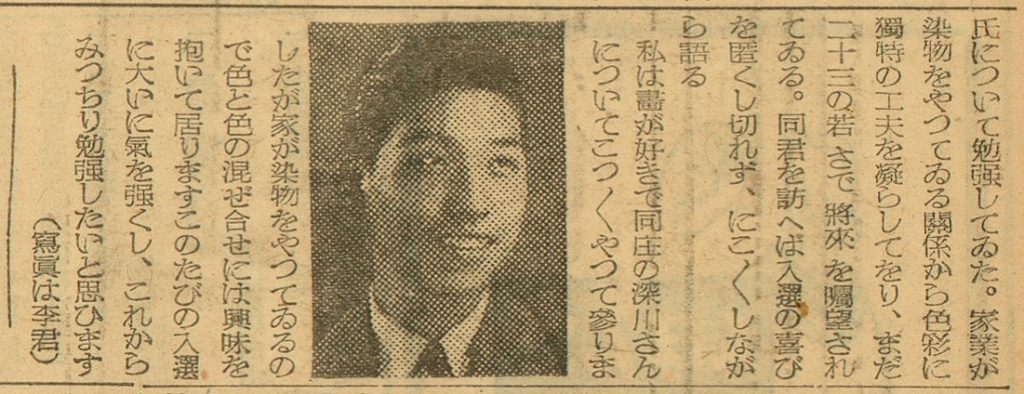 1942年10月21日《興南新聞》報導刊登一幀男子頭像,即正值青春年華的李揚波。(圖5)他向記者分享入選感言中,特別提到他從事的行業是如何影響自己的創作:「由於家裡經營染物,因此對於色與色之間的混合抱有濃厚興趣」,(註4)十分可惜的是,目前尚未尋得〈龍柱〉原作的情況下,我們僅能以黑白圖版一窺作品的面貌,揣度李揚波這句話的涵義。