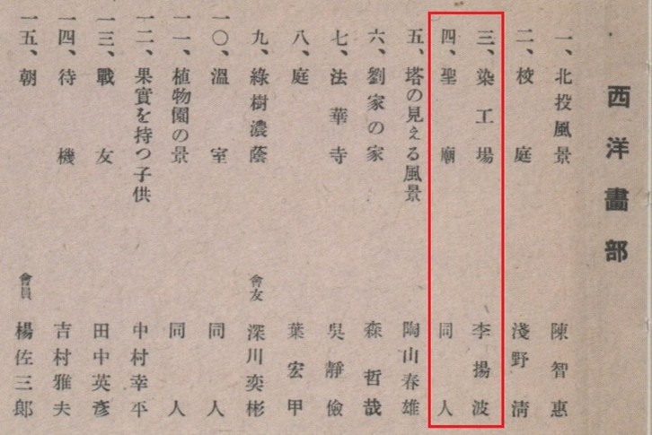 不過,染物業的影響或許不僅止於李揚波的用色,也體現於作品選題之上。在他入選第五回府展之後,持續參與第九回與第十回臺陽美術展覽會,若我們仔細觀察李揚波的作品題名(圖6)(圖7),得以發現如〈染工場〉(1943)與〈仕事場〉(1944),可能描繪的是染物工廠,抑或是李揚波勞動日常的生活側寫,有待未來進一步確認。