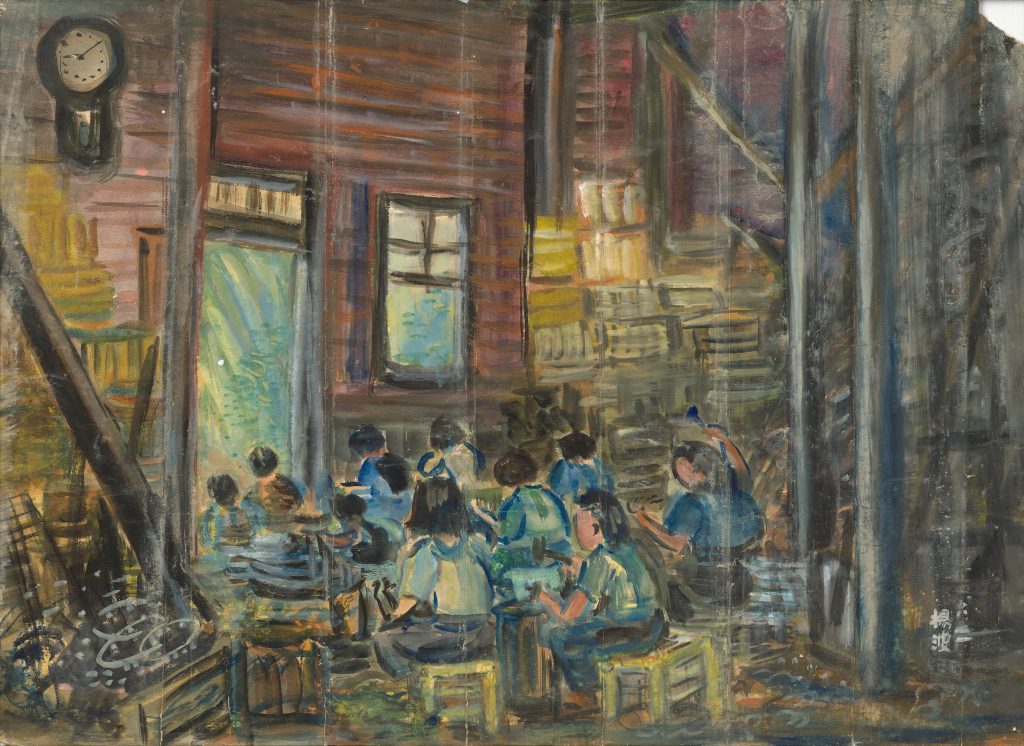 直到戰後,李揚波一方面持續經營染物業,另一方面在臺灣全省美術展覽會(以下簡稱省展)發表多件作品,自第一屆的〈勤〉(1946)(圖8)、第二屆〈室內〉(1947)(圖9)、第三屆〈街頭風景〉(1948)直至第六屆〈窯場〉(1951)與第七屆〈綠樹濃蔭〉(1952)。(註5)其中,首屆省展入選的〈勤〉,是目前已知李揚波僅存的作品。〈勤〉同樣為水彩創作,挑高的木造建築內,一群人穿著水藍色上衣,面向門窗外透露的光,屈身蹲坐在竹矮凳上,看似各自拿著一對黑色槌子,低頭專注於手上的工作。畫面左上方的高處懸掛一座擺鐘,鐘面精準指向「九點十分」的時間點,是否具有特殊的意義?引人無限遐想。