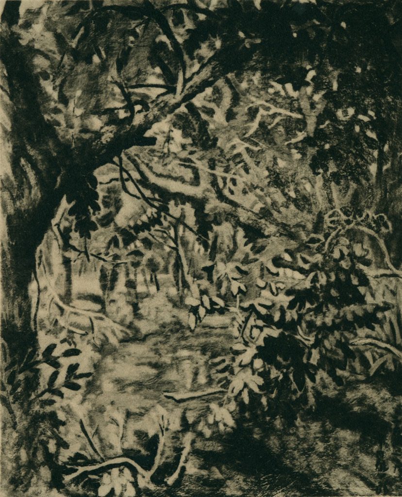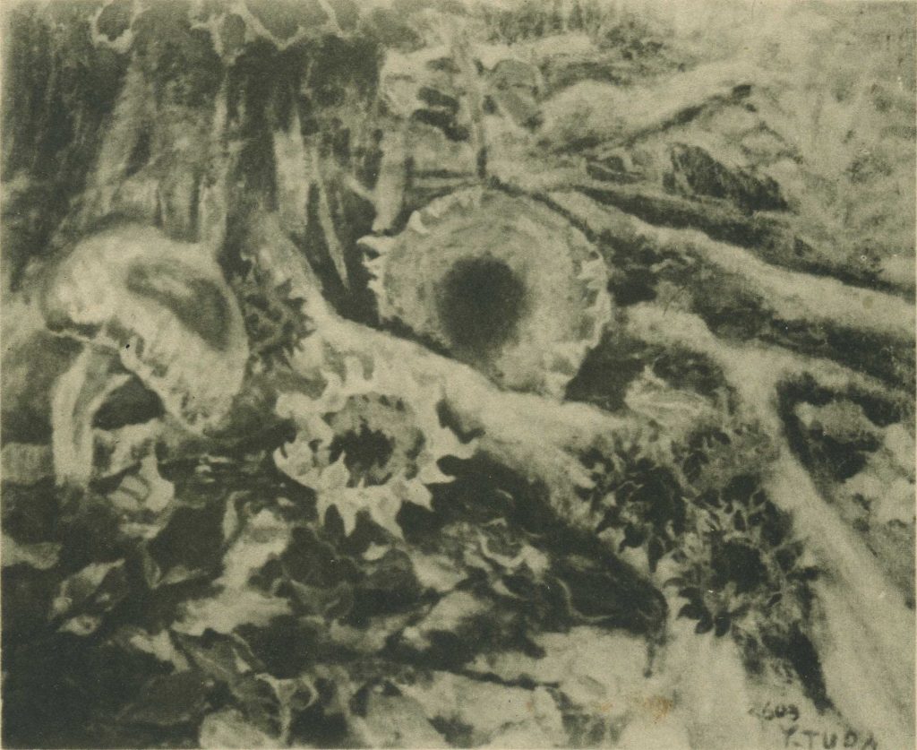 津田雄一郎早年入選府展的作品,分別是〈樹門〉(1942)與〈聚花〉(1943)。兩幅皆以植物為題材,〈樹門〉描繪不同樹種間,層層交錯的枝繁茂葉,形塑出豐富的視覺層次,畫面中下方似乎為一條小徑或是小河,有意無意地引領著觀者穿越層層樹叢,進入畫中。〈聚花〉則是以三朵向日葵為中心,畫家特意安排花朵不同的姿態,提供了觀看上的趣味性。王白淵在看完第六回府展後,認為這幅以剪斷的向日葵配著落葉的作品,既不像靜物也不像風景,不過可以從中感受到堅實的筆觸。(註3)雖然兩幅作品僅存黑白照片,但仍能看到畫家對自然的細膩觀察,透過生動筆觸與精巧的構圖安排,展現出富有生命力的風格。