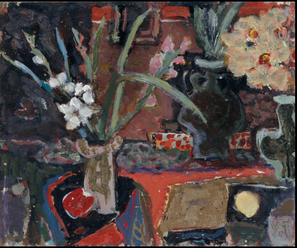 〈花競う〉獲得1953年第五回宮崎縣展特選,根據畫題名「花競う」,與其說是鮮花相競綻放,反而倒像是花與背景的華麗戰鬥。畫面分為前景、中景與背景,前景有黑、白兩色的花瓶,白花瓶插著紅花綠葉的劍蘭,左邊兩顆橘紅色水果墊在藍橘花布上,光前景就使用兩組對比色,使畫面產生活潑明快感。中間水藍色桌上又再放置一瓶矢車菊與一塊成團的日式花布,後方背景多彩的色塊像是掛畫或書架。視線順著右下角沿著畫面向左上角層層延伸,動態的視覺引導彷彿拼貼般的場景。(註5)想想這樣的擺設絕對不可能發生在家中吧,這正是畫家精心安排著「畫必須要有破調」。