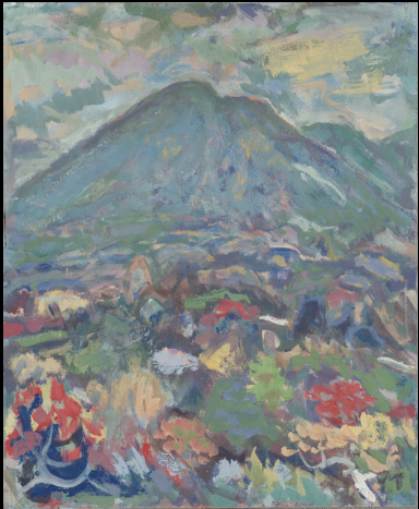 1986年〈霧島〉這件描繪霧島山群的作品,亦能見到木板上以黃色、紅色、綠色、橘色等不同色調的壓克力顏料,相互交疊、混融出一幅溫潤的風景;觀眾得以隨著這些色塊感受到畫筆在木板上跳動的筆觸,宛如塞尚〈聖維克多山〉那般明朗輕快。這三件作品大膽、多元、鮮明色彩,搭配獨特構圖,製造出畫面的趣味感。