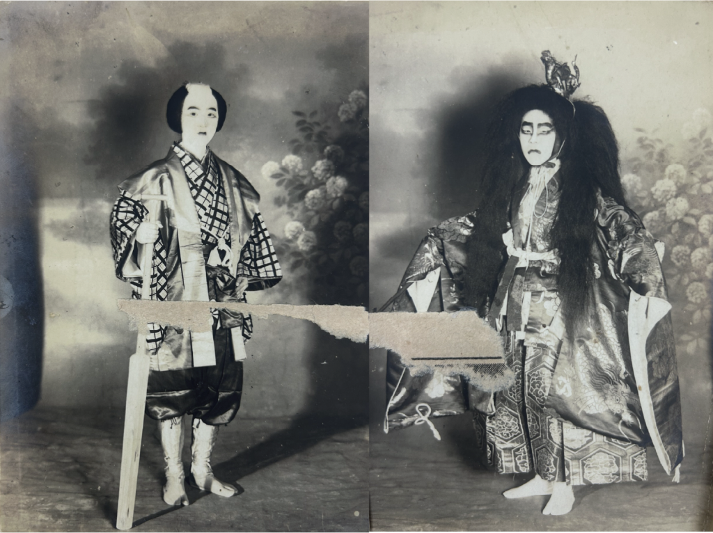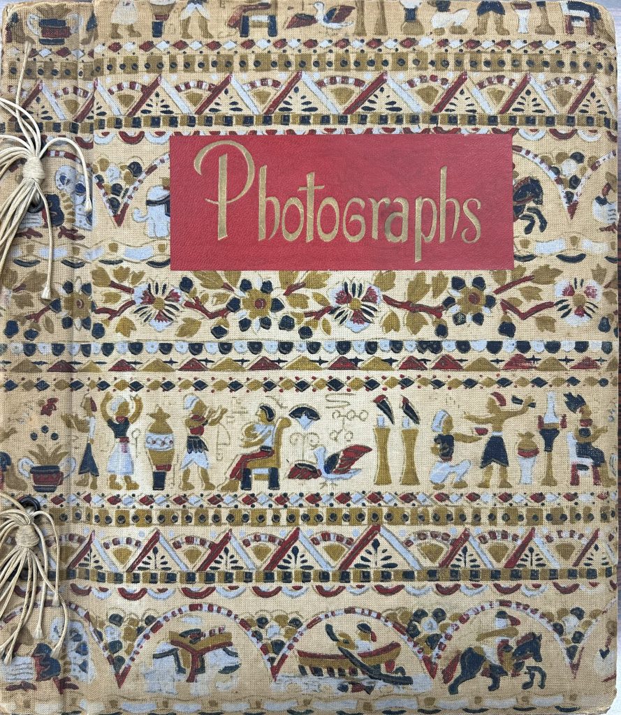 一本寫著「Photographs」的厚重寫真帖,封面以埃及風格的花紋裝飾。從書末的廣告標籤可以得知,這本寫真帖購自東京神田的東京書院,時間可能已經是終戰之後。翻閱寫真帖後發現,裡面照片的時序雖然有些混亂,但仍可以看得出來原主人細心地貼上照片,並且在側邊註記說明文字。寫真帖中最早的一張照片,約莫拍攝於1922年。相片中的小女孩身著華麗的和服、頭上綁著花飾,手中還拿著玩偶。照片的主角是年僅兩歲的殿村愛子,也是這本寫真帖的原主人。