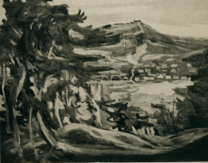 1942年,發生了一個轉捩點,這年廣瀨開始使用「廣瀨賢二」作為筆名持續投稿畫作(註7)。雖然並不知道廣瀨用此名創作的契機為何,不過這應該是象徵著某種轉變吧!在當年,他幸運地共有兩件作品入選府展:一幅〈溪谷〉以直式描繪溪水沖刷的動態模樣,使人感受到一陣沁涼;另一幅橫式〈南紀風景〉的地點則是離家鄉奈良不遠處的和歌山西部。構圖猶如1941年繪製的〈鹿野園の秋〉,皆站在高處遠望,兩側以較深色的樹叢、樹幹框出一格視窗,讓觀者的視覺焦點專注於遠山。