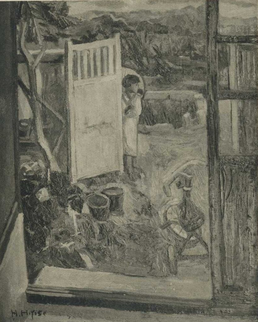 像是1940年入選府展的〈白い門(白門)〉正是他對日常細膩觀察的展現。從畫家視角來看,他應站在門口玄關處,望向門外的景色。畫面的右側是日式房舍木頭拉門,前庭停放著一輛三輪車;左下方堆放著數個盆栽。畫面中,白色外門成功地將觀者視角聚焦,門外還站著一位探出身子的小女孩。視線再向遠方望去,則是一片連綿的山景,由此推測畫作描繪的應是位在離山不遠的居所。