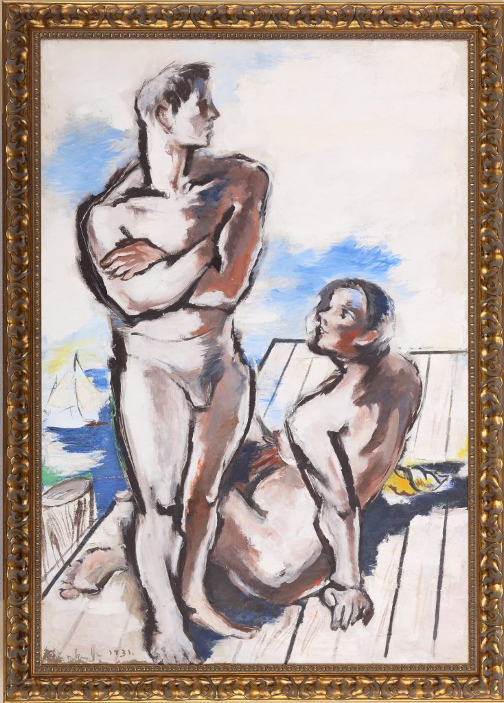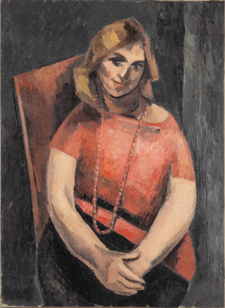 1922年中山巍前往法國學習。在法國的期間,他與里見勝藏、前田寛治、佐伯祐三、中野和高、福澤一郎等人往來密切,一起創作、一起聚會。「大家一起決定來野餐或是晚上去誰家集合等。是非常有趣的友情。」(註7)這群人其實在東京美術學校時期就已互相熟知,當時常在池袋相聚。再度於巴黎聚集的他們,自然地形成一個團體。這些年輕人接觸野獸派、立體派還有其他各種新興的藝術流派,他們敏銳地感受新的潮流正在吹起,這些吸收與嘗試也反映在他滯歐時期的作品上。例如,中山巍於滯歐時期創作的〈珊瑚色の服の女〉以線條與厚塗的筆觸強調輪廓與形體的建構,人體的表現走向幾何化、簡潔化;另外一張〈首飾りの女〉則幾乎看不到線條,主要色塊表現人體、物體及空間,平面化的構圖,使人不禁聯想到塞尚、高更等後印象派大師的作品。