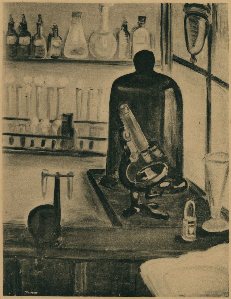 1931年,南風原朝保以西洋畫作品〈檢查室〉入選第五回臺展。作品取材自南風原醫院的研究室,畫面中央置放顯微鏡與大型玻璃罩,畫家細膩描繪儀器結構,展現近代醫學與科學技術的進步。畫面右側有片大窗戶,可以想像朝保日常在窗前進行研究與實驗的工作情景;後方櫃架上排列深淺不一的試管、燒杯等玻璃器皿,則展現了醫師生活的日常風景。