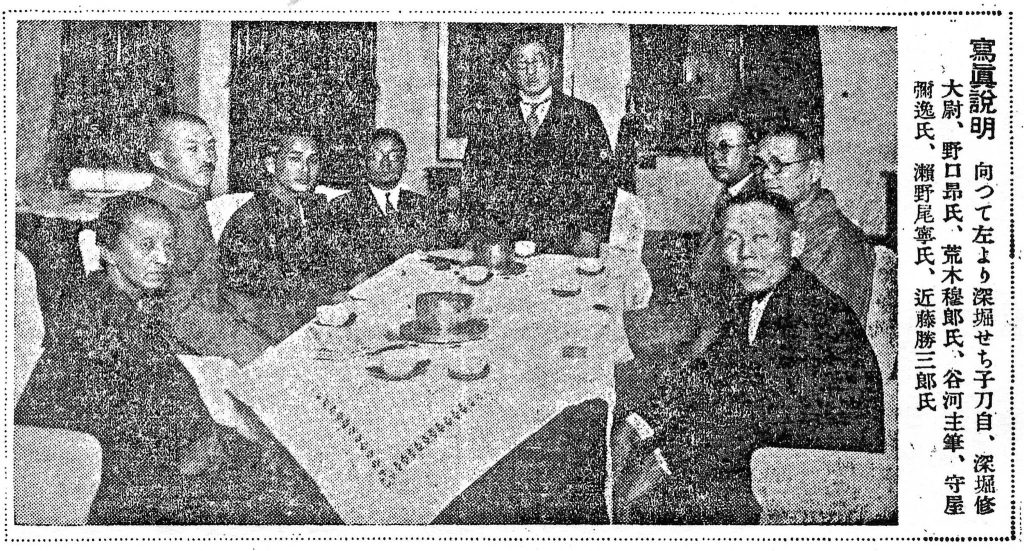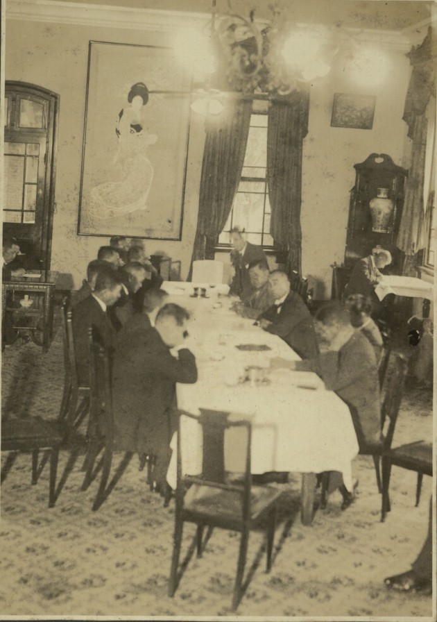 在那之後,加藤紫軒短暫返回日本,直到1930年代才再度來臺,而那幅在臺展中亮相的〈太魯閣峽〉則成了鐵道飯店的藏品。透過老照片比對,此作應是被掛在二樓的集會室。這裡曾作為許多會議的舉辦空間,因而留下一些照片,如首圖為臺北消防組長船越倉吉過世後,親友們齊聚於此舉辦的追思座談會。