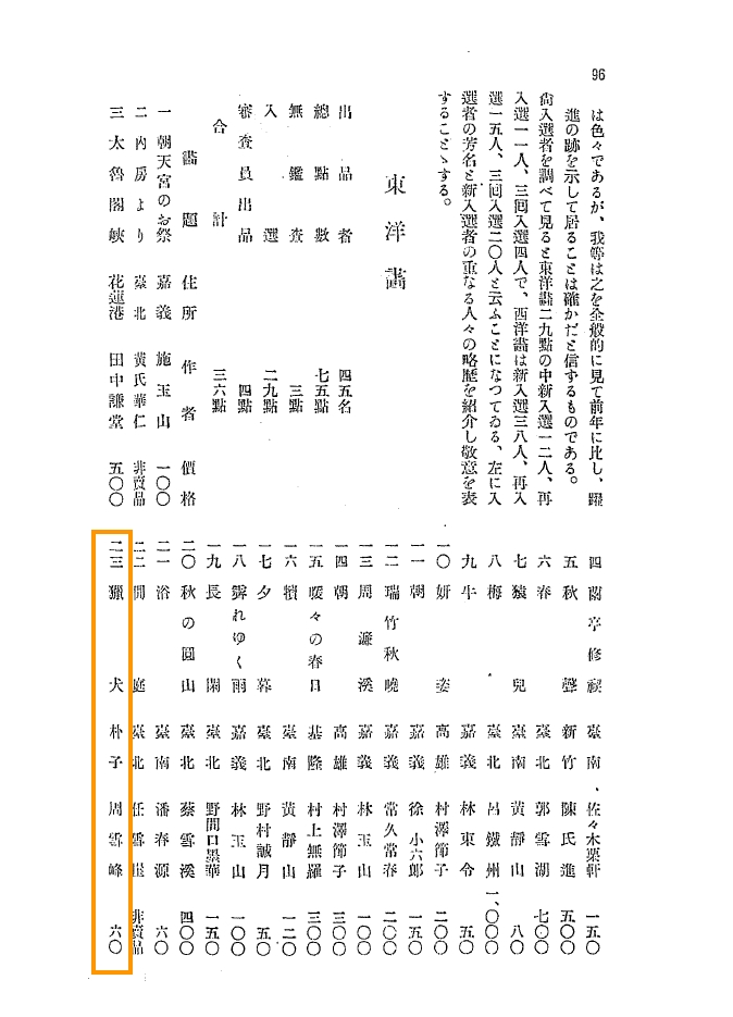 透過這張照片,我們可以留意到牆面上掛著一幅畫,那是周雪峰入選第三回臺展(1929)的〈獵犬〉。周雪峰是嘉義朴子人,少時拜藝師陳文通為師,學習寺廟彩繪、神像雕塑等技藝,學成後自立門戶,開設「西園軒書畫表具店」,今日仍由其子經營。