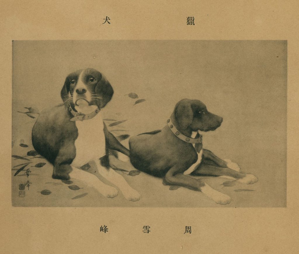 〈獵犬〉是周雪峰首次入選臺展的作品,描繪兩隻米格魯坐於落葉上,神情可愛。值得注意的是畫中犬隻形體寫實逼真,極富立體感,也許畫家早年有過炭精畫的訓練,才得以精準掌握獵犬的身形比例與肌理起伏。