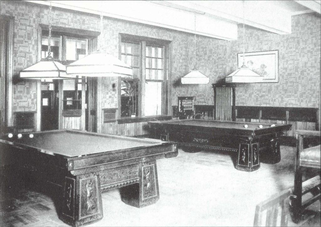 照片拍攝於臺北明石町的警察會館「娛樂室」。所謂警察會館是日本時代供警察及其眷屬宿泊與休憩的設施,不過也曾舉辦對外開放的演講或展覽等活動(1933年的竹久夢二展即是在此),可說是多功能複合的建築空間。而其中的娛樂室除了有如照片裡的撞球桌之外,也有乒乓球桌、收音機等設備,十分齊全。