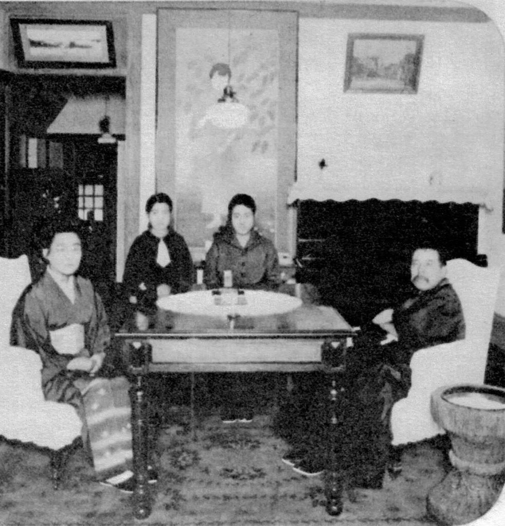 此外,拍照的地點、周邊的陳設也是相當值得觀察的細節。今天特別要提及的,就是在這張合照背景出現的人物畫,那是村澤節子入選第三回臺展(1929)的〈妍姿〉。