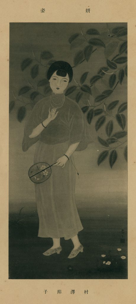 〈妍姿〉是他首度入選臺展的作品,描繪一名身穿大襟衫的女子,從其打扮與配戴的首飾來看應是身分不凡。藉《臺日畫報》的刊載可以得知這幅畫在展覽之後,由臺北第一高女校長清水儀六收藏。照片裡除了清水儀六與妻子かつ子外,還有兩名女兒美代子與富美子。